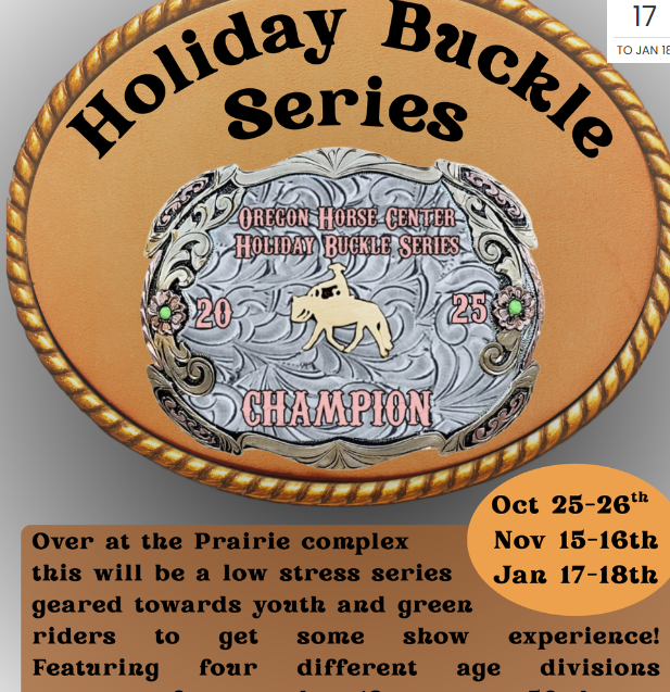 Holiday Buckle Series by Amy Klein | Jan 7, 2026 favorite_border iCal Export Google Calendar Outlook 365 Outlook Live 17 Jan Until 18 Jan Holiday Buckle Series Saturday, January 17, 202610:00 AM Sunday, January 18, 202611:00 AM Oregon Horse Center 90751 Prairie Rd Eugene, OR, 97402 (map) Scan QR Code